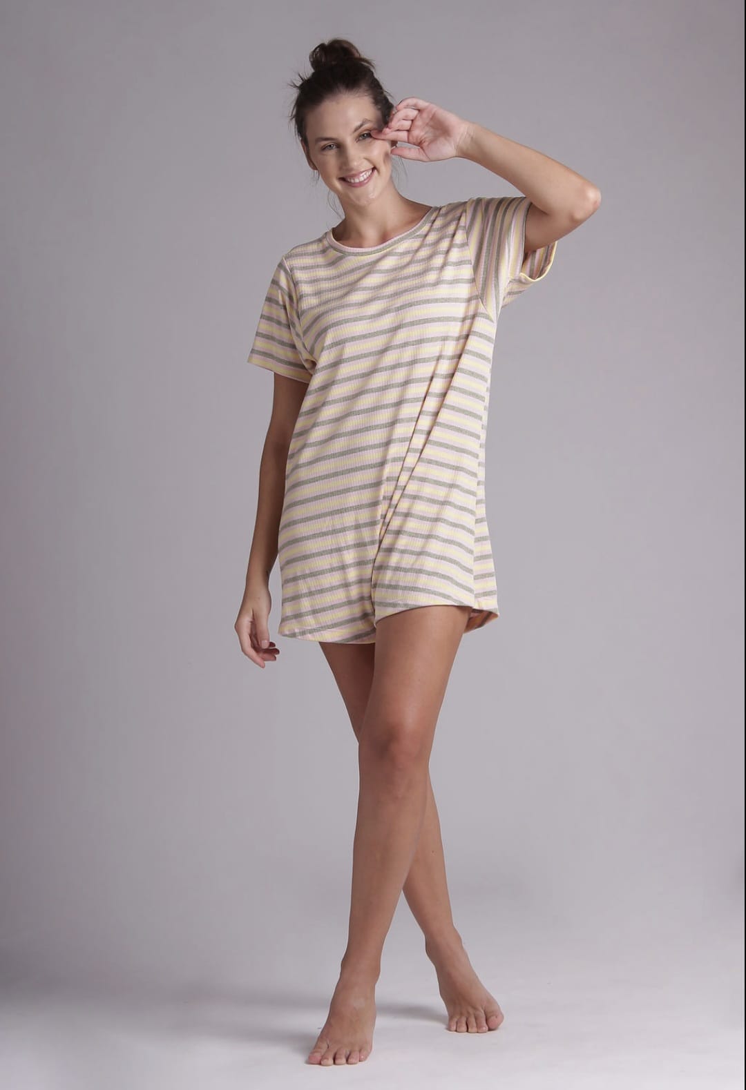 ESTE PIJAMA POSSUI GOLINHA REDONDA DE RIBANA , MANGA CURTA E DECOTE EM GOTA NAS COSTAS COM DETALHE DE UM PEQUENO BOTÃO E ASELHA NO ALTO DO DECOTE.